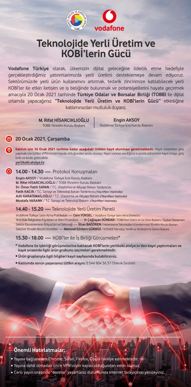Sanayi ve Teknoloji Bakanı Sn. Mustafa Varank ve Türkiye Odalar ve Borslar Birliği Başkanı Sn. M. Rifat Hisarcıklıoğlu’nun katılımıyla telekomünikasyon sektöründe yerli ürün kullanımını artırmak, Vodafone Türkiye’nin tedarik zincirine katılabilecek KOBİ’ler ile etkin iletişim ve işbirliğinde bulunmak ve potansiyellerini hayata geçirmek amacıyla 20 Ocak 2021 Çarşamba günü Saat 14:00’te ekli program çerçevesinde Teknoloji’de Yerli Üretim ve KOBİ’lerin Gücü Webinarı ve B2B Etkinliği internet üzerinden gerçekleştirilecektir.