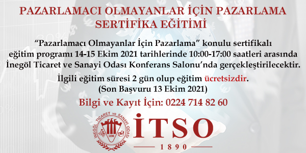 “Pazarlamacı Olmayanlar için Pazarlama” konulu sertifikalı eğitim programı 14-15 Ekim 2021 tarihinde 10:00-17:30 saatleri arasında İnegöl Ticaret ve Sanayi Odası Konferans Salonu’nda gerçekleştirilecektir.