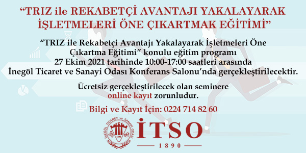 “TRIZ ile REKABETÇİ AVANTAJI YAKALAYARAK İŞLETMELERİ ÖNE ÇIKARTMAK EĞİTİMİ” konulu eğitim programı 27 Ekim 2021 tarihinde 10:00-17:30 saatleri arasında İnegöl Ticaret ve Sanayi Odası Konferans Salonu’nda gerçekleştirilecektir.