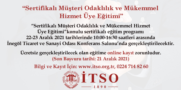 “Müşteri Odaklılık ve Mükemmel Hizmet Üye Eğitimi” konulu sertifikalı eğitim programı 22-23 Aralık 2021 tarihlerinde 10:00-16:30 saatleri arasında İnegöl Ticaret ve Sanayi Odası Konferans Salonu’nda gerçekleştirilecektir.