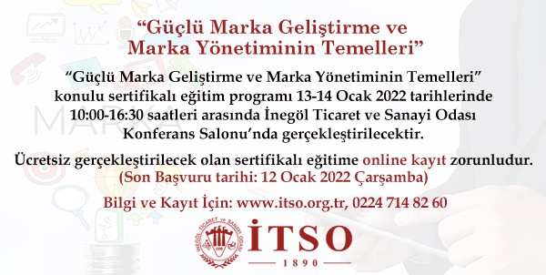 Üyelerimizin markalaşmasına ve marka yönetimine katkı sağlamak amacıyla 13-14 Ocak 2022 Perşembe ve Cuma günü 10:00-16:30 saatleri arasında Odamız Konferans Salonu'nda "Güçlü Marka geliştirme ve Marka Yönetiminin Temelleri" konulu eğitim düzenlenecektir.
