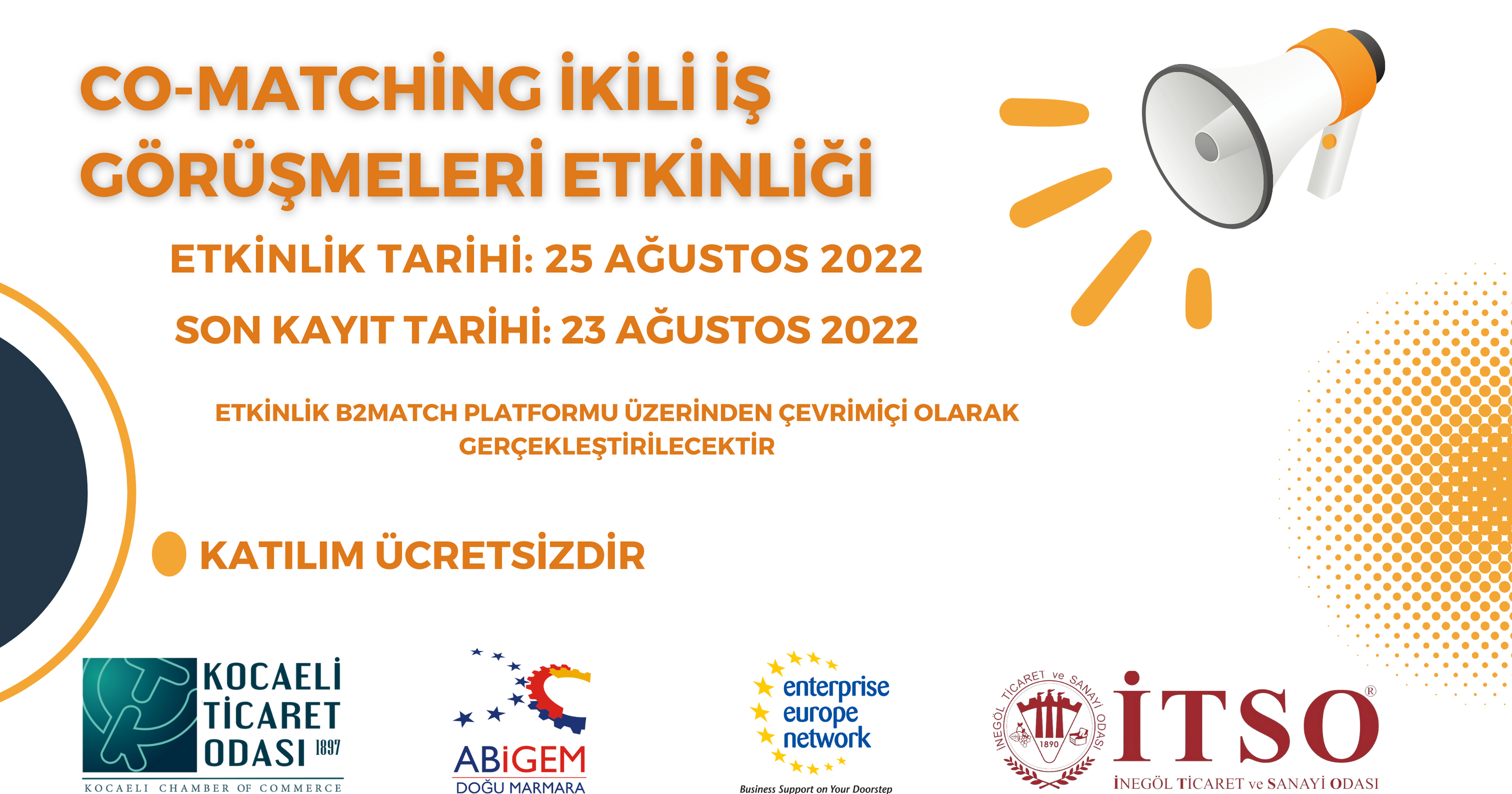 İnegöl Ticaret ve Sanayi Odası, Kocaeli Ticaret Odası ve Doğu Marmara ABİGEM işbirliğinde organize edilen Co-Matching İkili İş Görüşmeleri Etkinliği 25 Ağustos 2022 tarihinde b2match platformu üzerinden çevrimiçi olarak gerçekleştirilecektir.