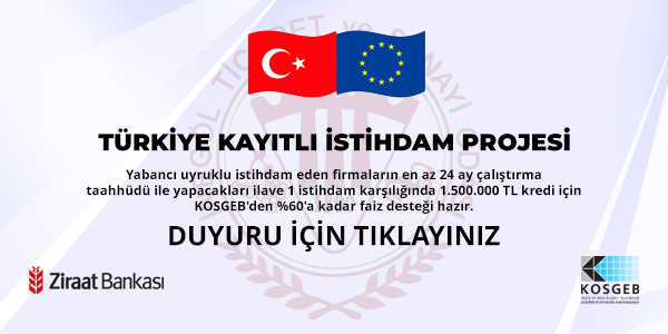 Alman Kalkınma Bankası tarafından finanse edilen ve KOSGEB tarafından faiz giderlerinin %40 veya %60'ının karşılandığı Türkiye Kayıtlı İstihdam Projesi'ndeki mevcut fonun henüz kullandırılmadığı ve Türkiye genelinde yaklaşık 650 firmaya yetecek kadar fon kaldığı proje kapsamında KOSGEB Bursa Batı Müdürlüğü'nde istihdam edilen ilgili personel tarafından Odamıza bildirilmiştir.