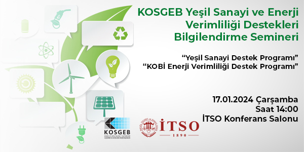 KOSGEB’in “Yeşil Sanayi Destek Programı” ve “KOBİ Enerji Verimliliği Destek Programı” hakkında Odamız üyelerine yönelik 17.01.2023 Çarşamba günü saat 14:00’de Odamız Konferans Salonunda bilgilendirme semineri düzenlenecektir.