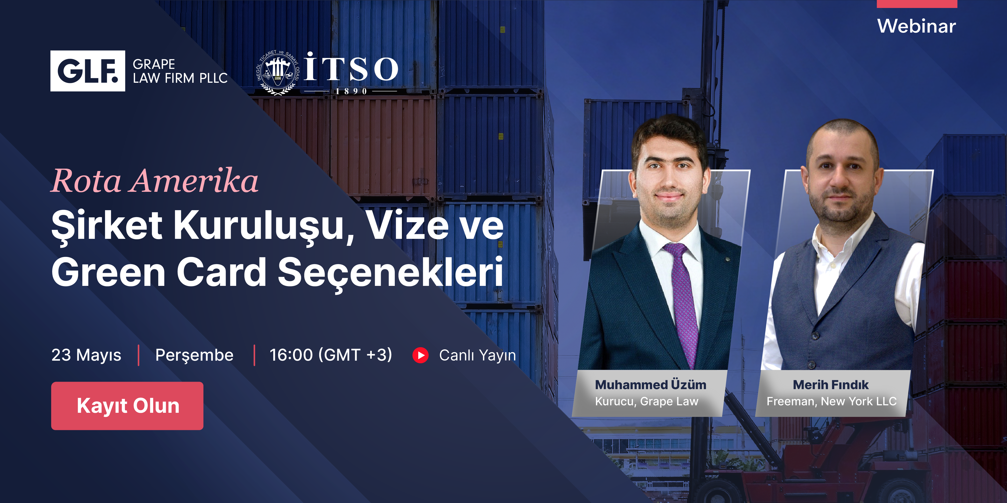 Odamız ve Grape Law Hukuk Bürosu iş birliğinde 23 Mayıs 2024 tarihinde saat 16.00'da Amerika'da iş kurma, vize ve green card süreçlerinin ele alınacağı "Rota Amerika” adlı online bilgilendirme semineri (webinar) düzenlenecektir.