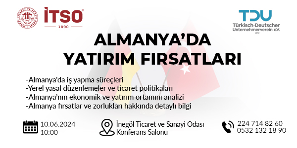 10 Haziran 2024 Pazartesi günü saat 10.00’da Odamız Konferans Salonunda Türk-Alman İş İnsanları Derneği Yönetim Kurulu üyeleri ile birlikte Almanya'da yatırım yapma potansiyeli hakkında kapsamlı bir bakış sunacak olan ‘Almanya’da Yatırım Fırsatları’ başlıklı ücretsiz bir seminer gerçekleştirilecektir.