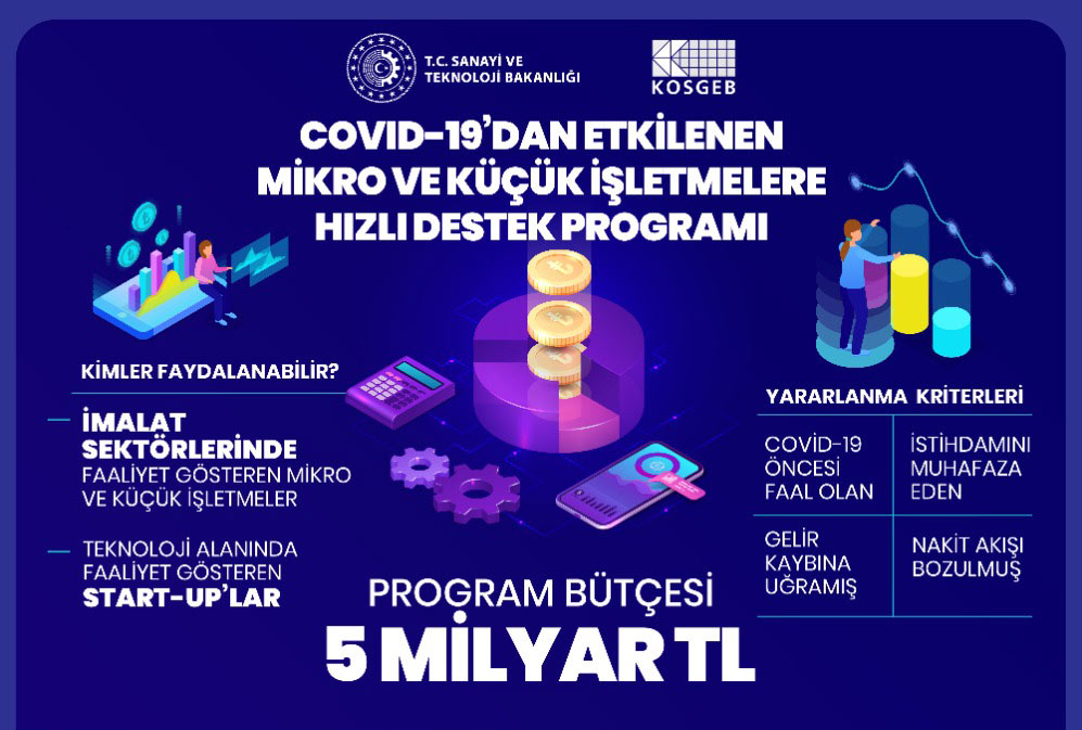 Covid-19 salgınından etkilenen imalat sektöründeki mikro ve küçük işletmeler ile 2017 ve sonrasında kurulmuş imalat, bilgisayar programlama ve bilimsel Ar-Ge sektörlerindeki yenilikçi genç işletmelere KOSGEB tarafından “Mikro ve Küçük İşletmelere Hızlı Destek Programı” kapsamında sermaye desteği sağlanacaktır. Desteğin amacı, öncelikli sektörlerdeki mikro ve küçük işletmelerin (MKİ’ler) salgın şartlarına rağmen faaliyetlerini sürdürebilmelerini ve istihdamlarını salgın başlangıcındaki seviyede koruyabilmelerini sağlamaktır.