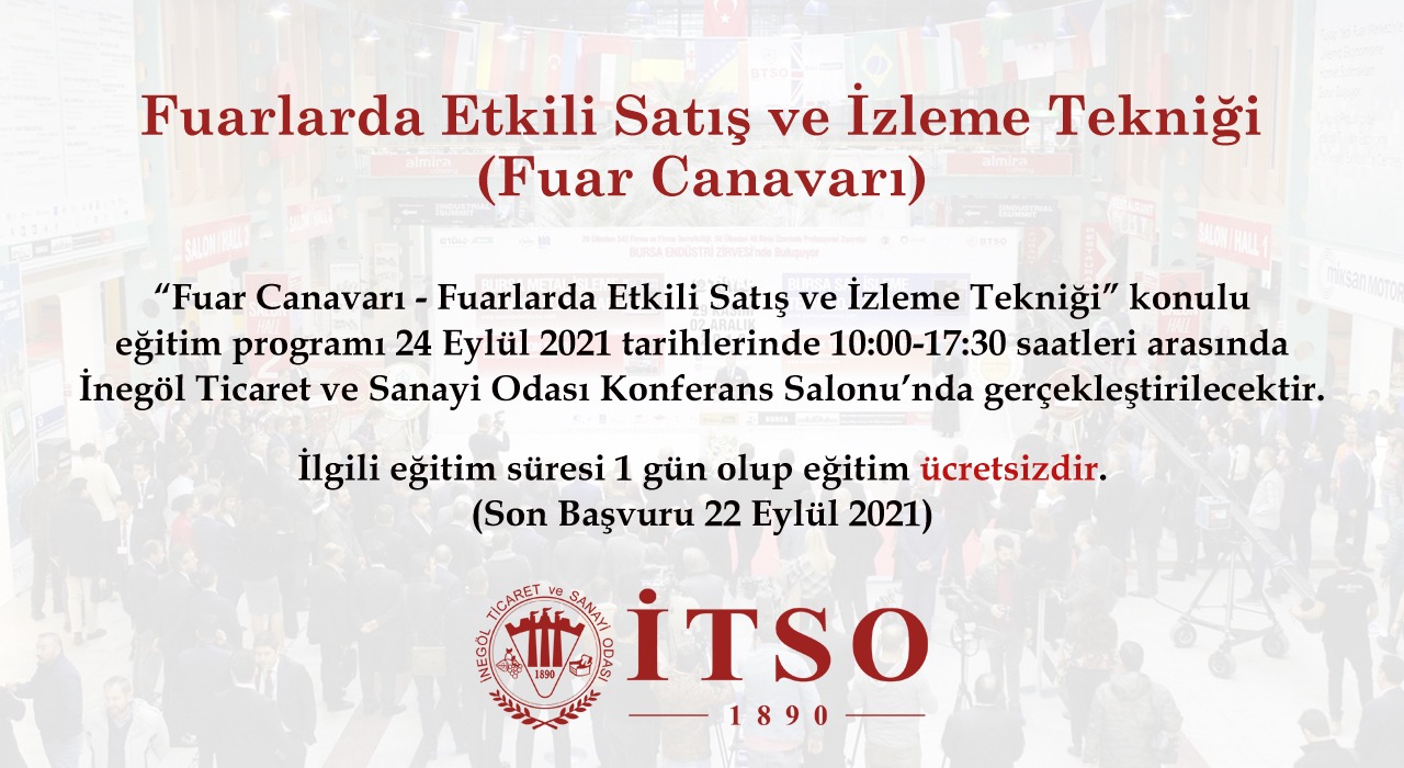 “Fuar Canavarı - Fuarlarda Etkili Satış ve İzleme Tekniği” konulu eğitim programı 24 Eylül 2021 tarihinde 10:00-17:30 saatleri arasında İnegöl Ticaret ve Sanayi Odası Konferans Salonu’nda gerçekleştirilecektir.